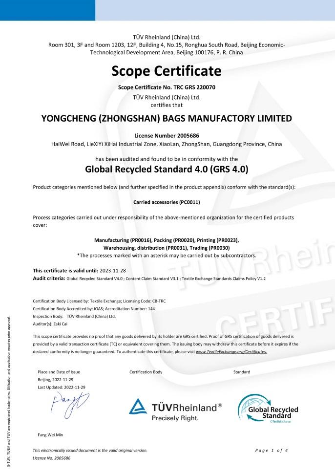 Recycled Standard 4.0 (GRS 4.0) which issued under Scope Certificate Number – TRC GRS
